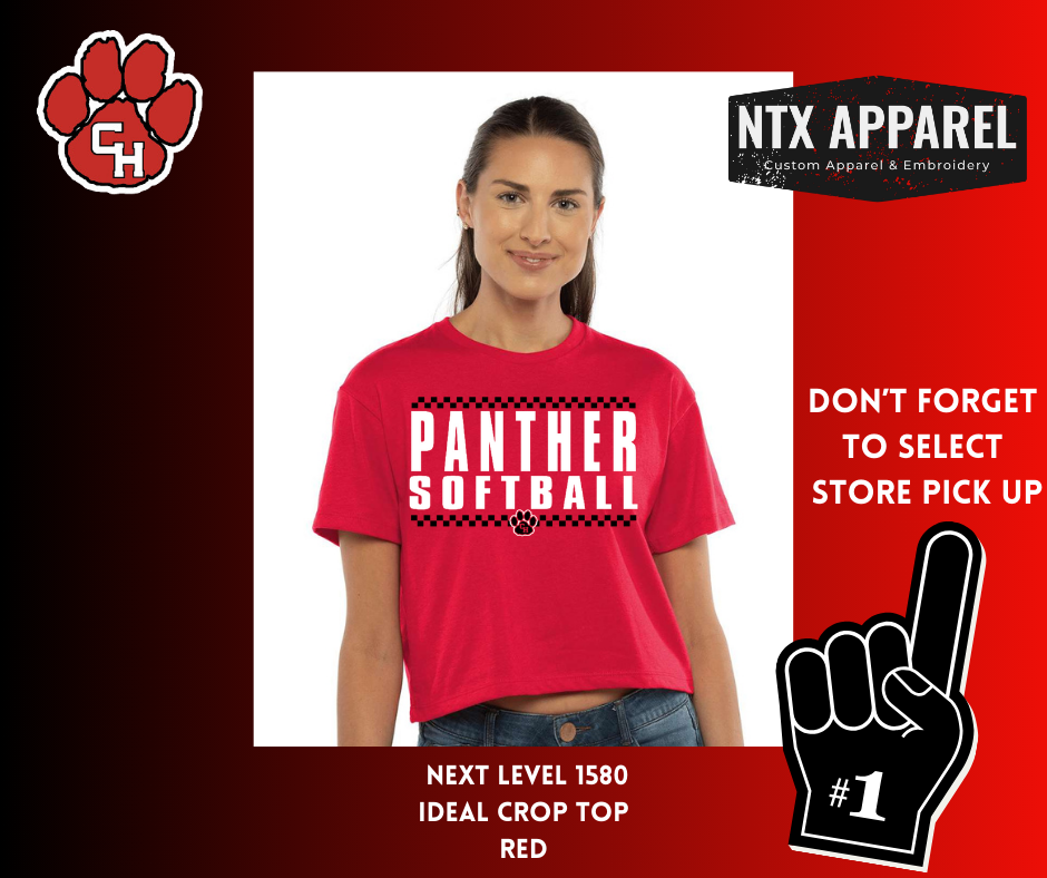 Please allow 10 business days for production. Please select STORE PICKUP at check out. Panther Softball items will not be shipped. All sales are final. Please email ntxapparel@gmail.com if you need assistance with your order.