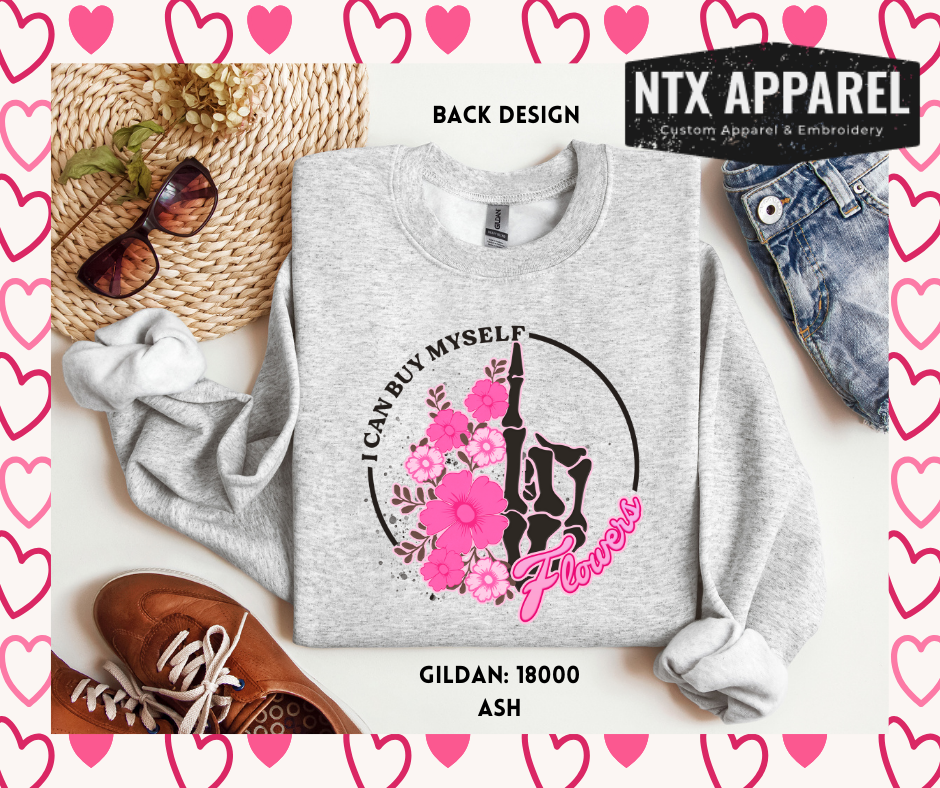 Get yourself flowers this Valentine's Day with our "I Can Buy Myself Flowers" crewneck sweatshirt. Show off your independence and treat yourself to the beauty of nature. Made with high-quality materials for ultimate comfort. Get yours now!